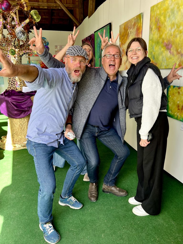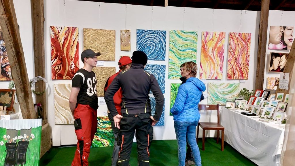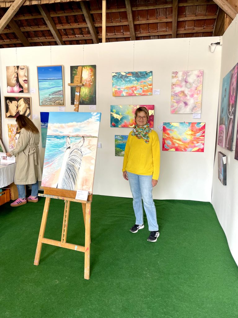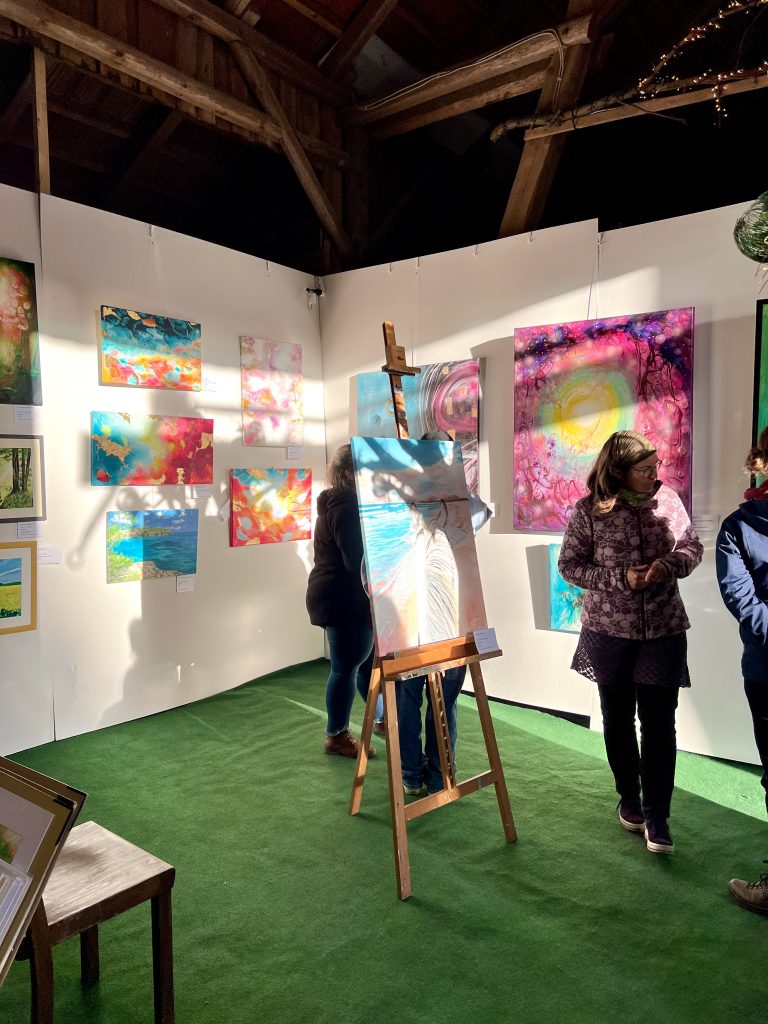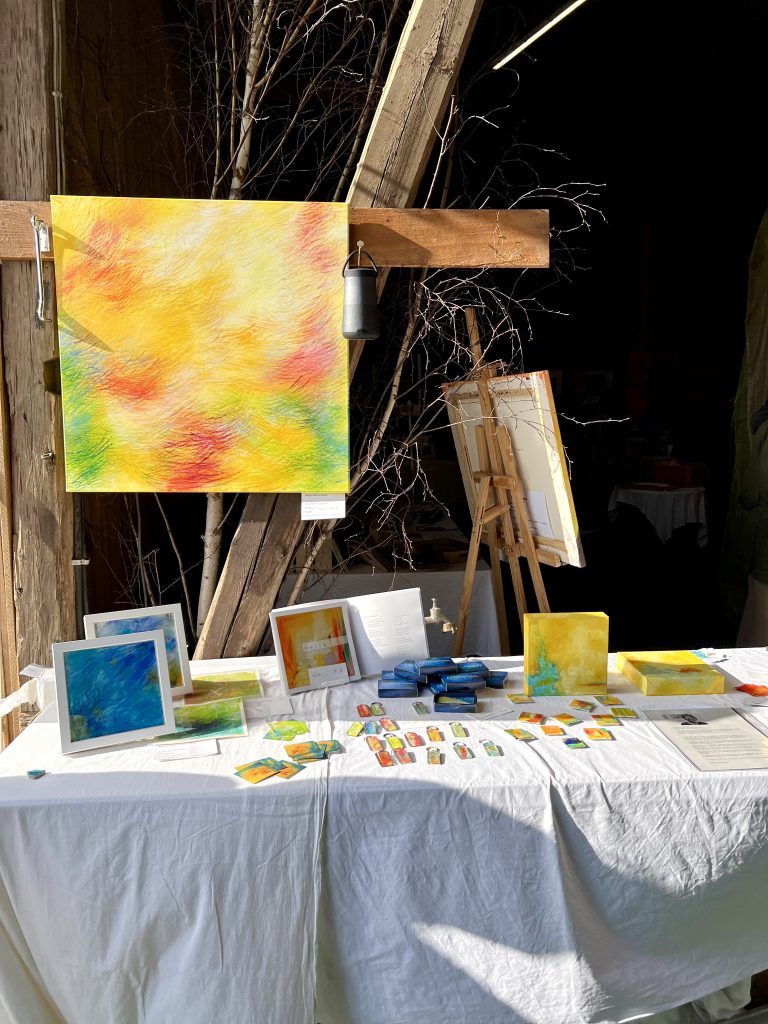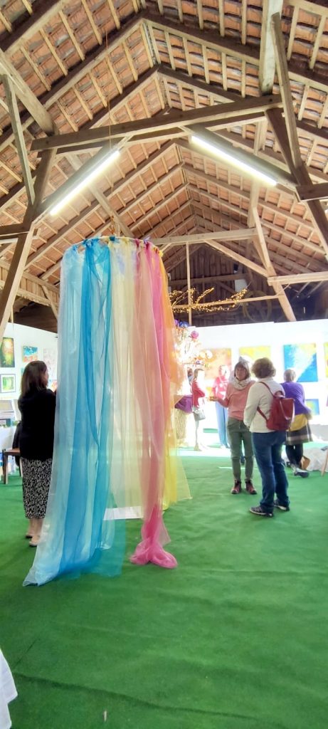 Es war ein liebevolles, gutes Miteinander beim Aufbau und während der Ausstellung. Wir stellten fest, dass hier ein richtig gutes Team entstanden war, d.h. noch mehr gute Freunde. Die Atmosphäre war schon beim Aufbau inspirierend und der Raum füllte sich mit Farbe, Licht und Herrlichkeit.