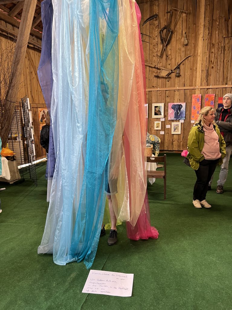 Die Ausstellungsfläche wurde mit Tischen erweitert und die Aktionsplätze hergerichtet. Für die Kinder bereiteten wir einen kleinen Webrahmen mit bunten Stoffen zum Weben vor. Eine Installation, die aus einem umkleideten Hula-Hoop-Reifen, an dem rundherum lange Organzatücher in vielen Farben hingen, war als Idee nach einem Monatsmeeting entstanden und nun umgesetzt worden. Die Menschen konnten in die Mitte dieses Kreises treten und ein Stück vom Himmel erspüren, durch die Sanftheit der Tücher, die um den Körper strichen, einen geborgenen Ort hinter herrlichen Farben entdecken. Die Gegenwart Gottes war darin stark zu spüren. So bekamen die Menschen etwas von dem Fluss des Himmels mit.