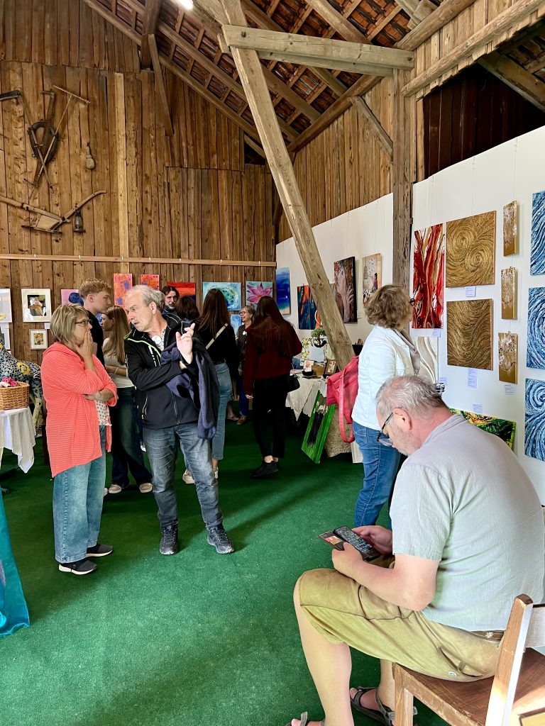 Mit dabei waren: Sonja und Elmar Kreisel (Malerei und Skulptur), Anke Wiemer, Petra Krzeminski, Cornelia Patschorke, Solveig Schäfer, Annette Gut, Bettina Paa (Keramik). Unterstützt wurden wir von einigen Ehemännern, wie von Horst Krzeminski, Michael Gut und Ludwig Wiemer. Elmar und Sonja bereiteten ihre große Scheune für dieses Event, Wochen vorher, mit viel Muskelkraft und Liebe vor. Elmar hatte Stellwände montiert, die sie weiß gestrichen haben. Ebenso bekam der Scheunenboden einen Grasteppich. Am Samstag vor der Eröffnung hängten wir die Bilder mit gegenseitiger Hilfe und tatkräftiger Unterstützung der Männer auf.